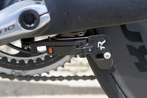 TriRig Omega brakes also handle the stopping of the rear Knight Composites 95 Clincher wheel. The tire in the back is also a 23mm Continental Grand Prix TT model.