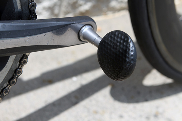 23mm Continental Grand Prix TT tires up front on the Knight Composites 65 Clincher wheel. Stopping is handled by a TriRig Omega brake.
