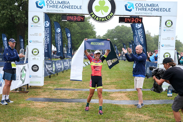 Kim Webster was at the pointy end of the field in the women's elite division. While female participation is hovering at 37% in USA Triathlon races, Boston is closer to 50% of the field. O'Neil deliberately positions Boston Tri as an inviting race to women. What does that mean? The race hosts social runs at health clubs, local bike and run shops and urges group training.