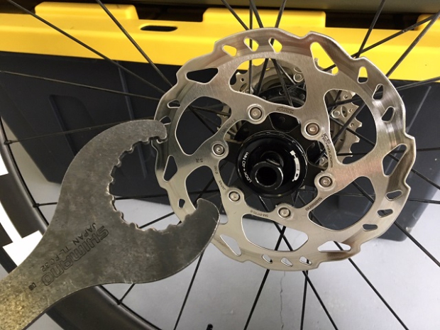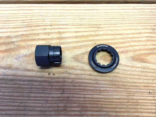 The second style of Centerlock is specific to wheels with 12 and 15mm thru axles, and requires a Shimano bottom bracket tool: