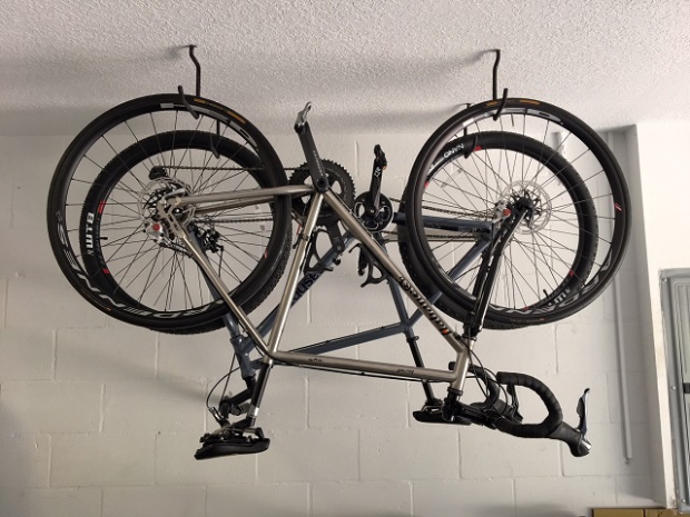 The main thing to be aware of for bicycle storage is that you shouldn't hang a bike equipped with hydraulic disc brakes upside down (note that my two bikes pictured here have mechanical discs, which are fine to hang upside down).
