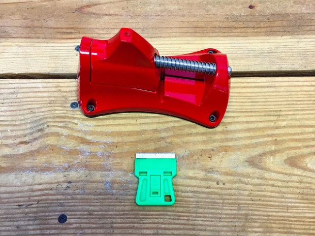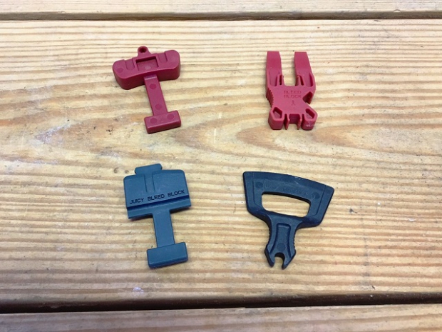 These are bleed blocks / pad spreaders. If you took my advice and bought a bleed kit, it should have included a couple of these (they're a tool that's normally used in the bleed procedure for hydraulic brakes). When you put your bike in a travel case, you should always have a bleed block in each caliper to ensure that the pads stay put. If there is no bleed block and the brake lever gets squeezed, it will advance the brake pads, reducing the already-super-tight clearance between the rotor and pads. With a bleed block in place, this won't happen. Oh, and make sure that the bleed blocks are clean and grease-free so you don’t contaminate your brake pads and cause squealy brakes upon arrival at your destination.