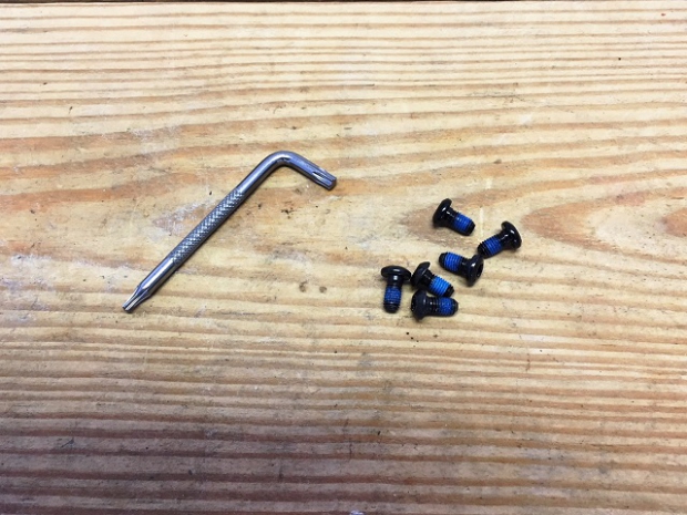 There are two main systems for attaching a rotor to a wheel. The first uses six small Torx T25 bolts. All you need is a T25 Torx wrench (and most manufacturers recommend that you use a torque wrench for this, meaning you'll need a T25 Torx bit with 1/4" driver).