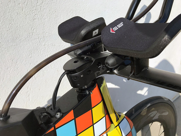 "The crazy bike paint design was done by my immensely talented wife Robin, who is an interior architect, and inspired by the logo of the coaching company I own and head up, TriBy3 Performance Coaching. The logo, attached, originally had this fade from dark blue to light blue, orange to yellow, and three roads meeting as one. Robin wanted to change it up and do a solid color blocking pattern, and I said make it loud, and we ended up with checkerboard bike, helmet, and race kit and just wait until the new shoes from Rocket7 come next week!" said Greg Close.