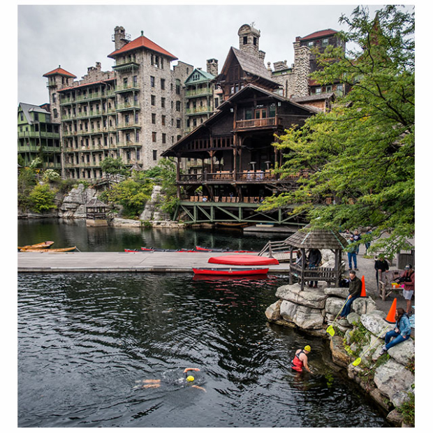 Turner exited water in front of the 150 year old Mohonk Mountain House resort with solid lead for the final .7 mile run to Sky Top Tower and the “Survivor Line.”