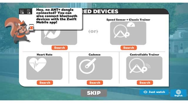 Assuming everything is plugged in and operational, hop on the bike, start to spin, and fire up Zwift. The first screen you encounter in Zwift is the Device Pairing screen: