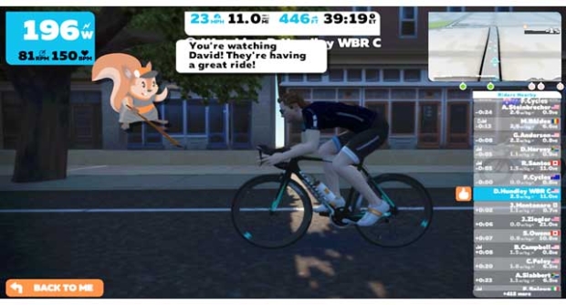 Since this is our first ride, your screen will look like the one above. If you hesitate, things start to get a little weird – a squirrel starts to talk to you. In case you’re wondering, the squirrel’s name is Scotty. At this point, we can click the “Just Watch” button to watch other people having fun and getting in a good workout: