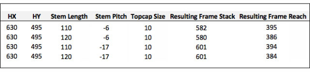 “With a 630/495 HY/HX, a few stem options and a little trig will help us back into frame geometries that would be appropriate. [And then he produced for me the table below]: