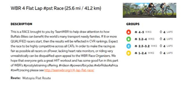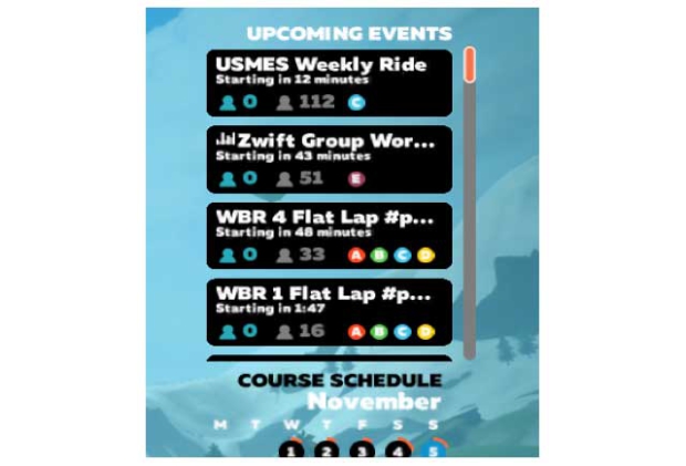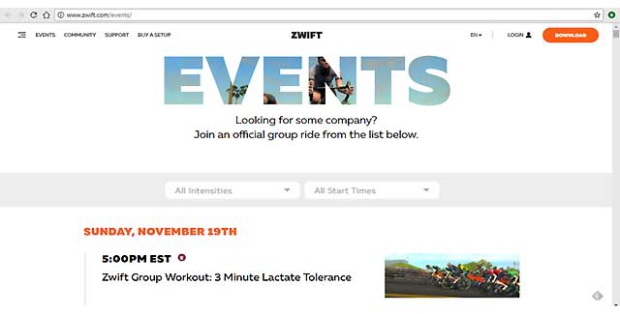 The good thing about Zwift is that you don’t have to RSVP to the party; you just show up. You just need to know what is happening and when. The best place to see this is at www.zwift.com/events: