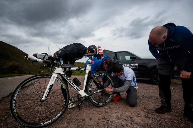 Bike repairs while on course are always a bummer, but when the athlete and the crew are calm it is not such a big deal. Plus it is a very long day, so much can happen.