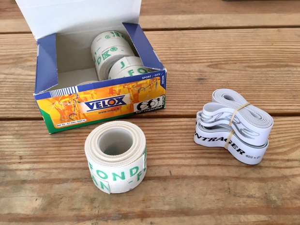 For tubed tires, it’s become common knowledge that you want a nice and durable rim tape, with Velox-brand cloth tape being a perennial favorite for bike mechanics around the world. This still holds true, and I have a box of Velox in my garage still today. There are also non-adhesive nylon or plastic rim tapes that are a stretch fit over the rim, which tend to work fine as well (though they can become pushed off-center more easily than Velox, which has a light adhesive to help it stay put).