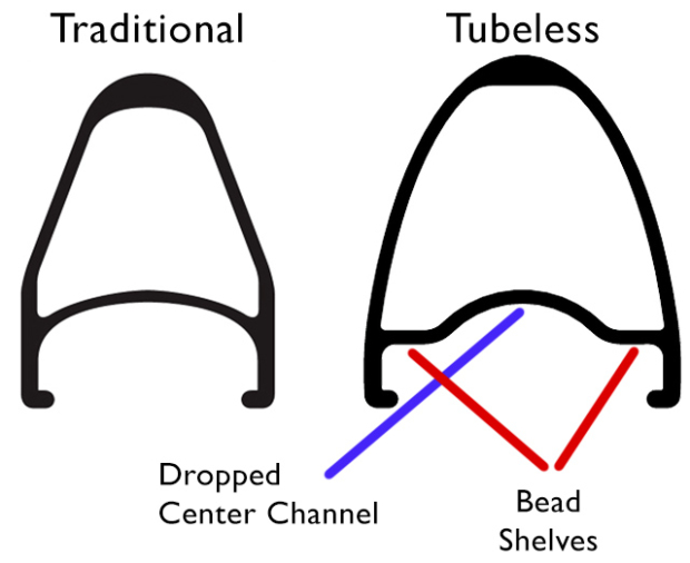 The most misunderstood aspect of tubeless tech is the inside rim profile. The image below should clear things up, with an old-style tubed rim (left) compared to a new-style tubeless-ready rim (right). As you can see, the older rims had a curved rim channel. As you inflate the inner tube, it pushes out on the tire, forcing the tire beads into the corners of the rim.