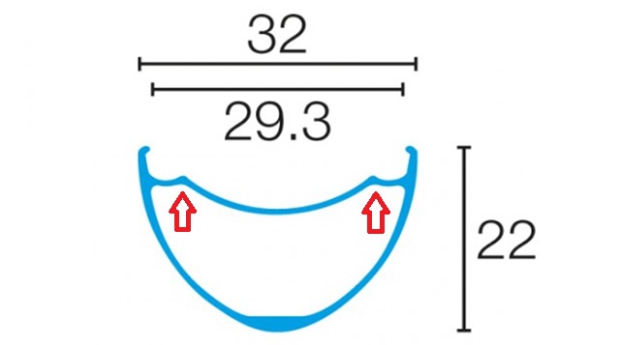 Despite the good intentions, the extra spikes often make tire installation very difficult if they’re too tall. The image above is a cross section from the now-discontinued American Classic Lightning MTB wheel. It has a shallow rim bed plus very pronounced edges on the bead shelves (emphasized with red arrows). I spent well over an hour installing two very common tires on a pair of these wheels – having to go well above the maximum inflation pressure and using copious amounts of bead lubricant to finally get the tire beads in place. This issue is irrespective of TLR vs tubed tires – it makes installing ALL tires difficult. Always use a slick tubeless tape on such rims, which help the tire beads slip into place. The best way I’ve found to remove a tire in this case is to lay the wheel on the ground and carefully step on the side of the tire to smash it down into the dropped center rim channel.