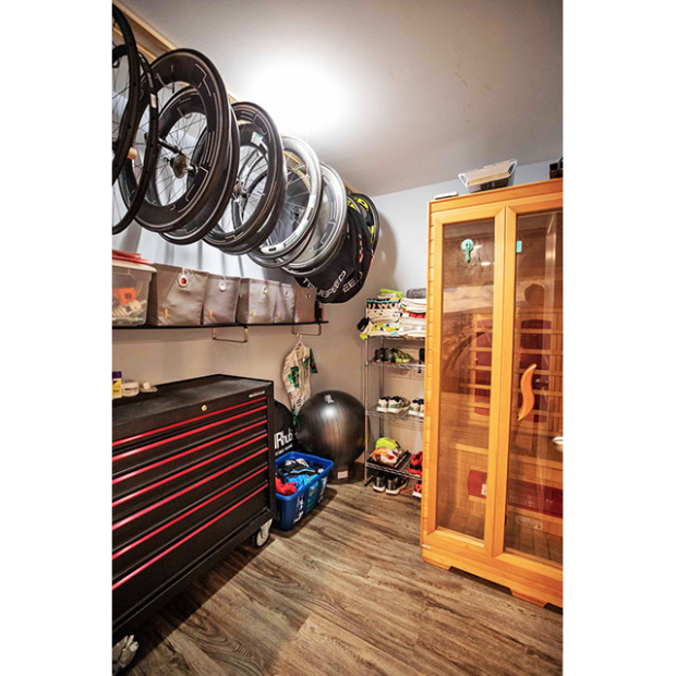 The Heat Room with an infrared sauna, which can be adjusted up to 150 degrees Fahrenheit. Sanders also uses this space for storage. Neatly ordered, easily accessible parts include HED wheels hung from the ceiling and plastic basins for training shorts, shirts and jerseys, socks, towels and various training items.