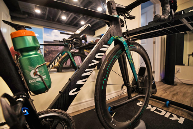 Canyon Aeroad with Stages dual-sided power meter in the Cycle Station with bottle of Gatorade Endurance.