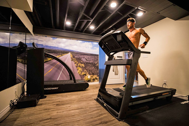 Seen here, Lionel Sanders runs on his old Nordic Track C1750 treadmill with Wahoo Fitness Kickr Desk. Sanders says, “It has been through countless trials and tribulations – and I have rebuilt pretty much everything. New deck. New motor. Control Panel replaced three times. All the belts have been replaced.” One feature recommends this old reliable, what Sanders calls “the runner’s flex. When I run it flexes an inch or so which is fantastic for the joints. Especially when you are a little bit weary of the taxation of running – especially when recovering from my March sacral injury.” In the background is his Woodway Treadmill, which he describes as “The gold standard of all treadmills,” which is rated for approximately 200,000 miles. On the wall is a motivational mural of Sanders riding in Kona on the road back from Hawi: “You can see on this day that the crosswinds were coming up. I can’t wait.”