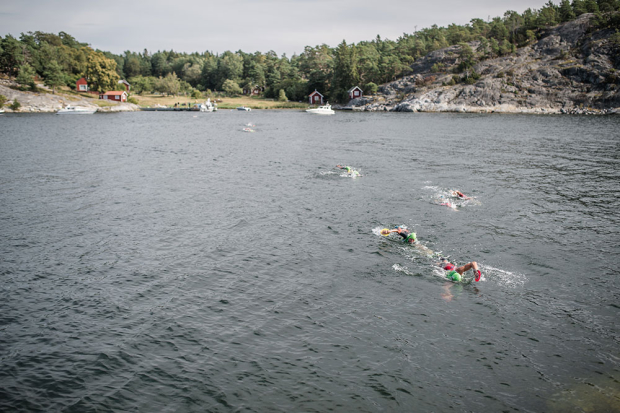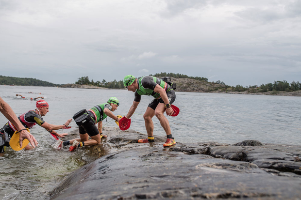 The men's race was very tight and here Pontus Lindberg of Team ATG Sport is seen leading team mate George Bjälkemo, the defending champions Fredrik Axegård and Alex Flores of Team ARK Swimrun and Lars Ekman and Jonas Ekman Fischer of the Sailfish team Bröderna Bäver out of the water late in the race.