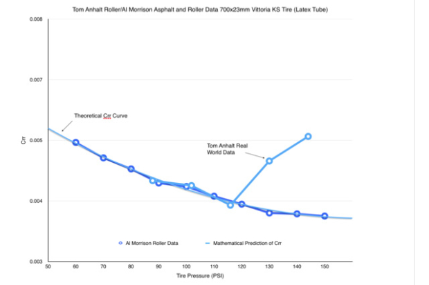 Using roller data from Al Morrison and on-road data from Tom Anhalt, you can see a clear breakpoint in the graph where rolling resistance appears to increase sharply (around 115psi – and note that this was a relatively smooth road). Rougher roads result in a breakpoint at significantly lower pressures.