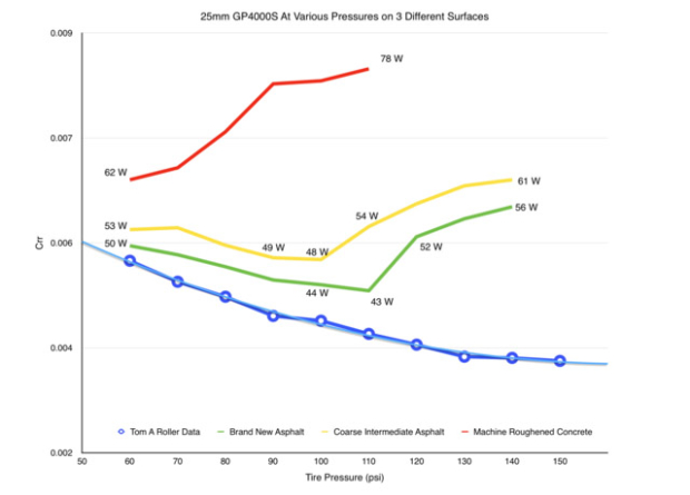 The graph below shows how much worse things get with rough pavement (the red line) – with the fastest setup at a low 60psi.