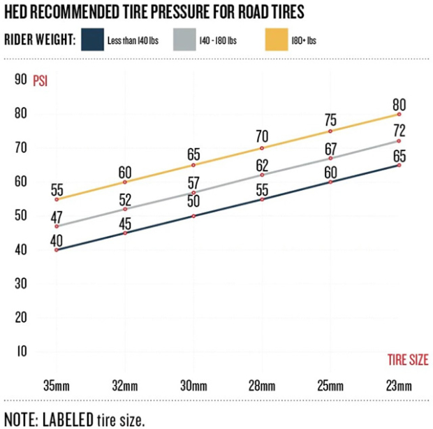 HED adds a footnote that says for every 20 lbs of body weight beyond the maximum on the chart, add 5 psi. For me, this lines up exactly with the pressure I ride on average road surfaces. Of course, if you weigh less than the chart shows, you'll need to drop your pressure a bit.