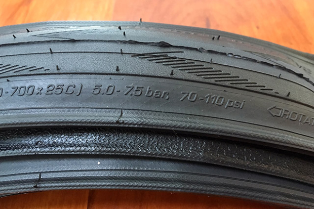 Brands such as Schwalbe say that lower pressure reduces your chance of a puncture on the road. In short, the tire is more supple and able to flex around a potential puncture-causing object. I’ve never seen any clear data to support it, but the logic makes sense. The counter to this is that if you run your pressure too low, you increase your risk of a pinch flat (a.k.a. snake bite) puncture, where your tire or inner tube gets pinched as your wheel bottoms out on the road surface.
