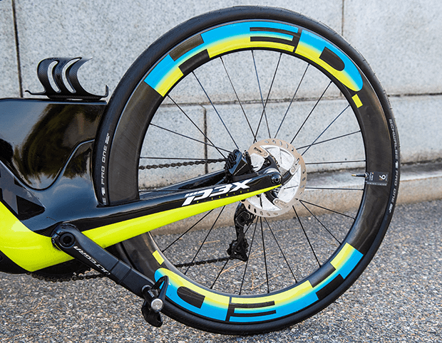 This bike has HED Vanquish wheels, and you might wonder how you get these decals on a bike like this. HED makes its products in its own factory. HED can do what it wants. Like make decals that match a bike.