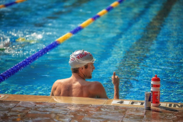 Nilsson does his swim sessions at VillaSport Athletic Club and always starts out with some light stretching and band work. One of life's mysteries is how all of that hair fits under a swim cap.