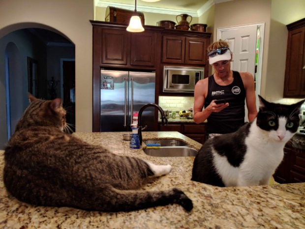 The 2x defending Kona champion is not the only one amused. Gibbons' family dog, Terrwyn, a mini Airedale Terrier, entertains with a series of hot laps in the backyard.