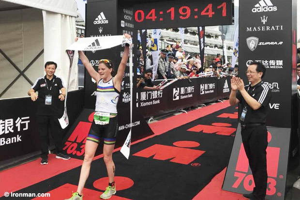 Ironman 70.3 rookies and ITU Olympic distance stars Marten Van Riel of Belgium and Ashleigh Gentle of Australia won Xiamen 70.3.