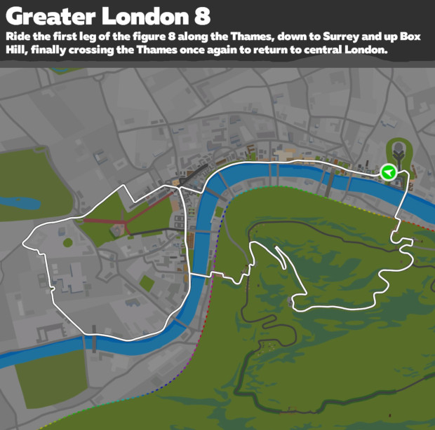 With a minimal lead-in, this route takes you on a figure 8 through London and then up Box Hill.