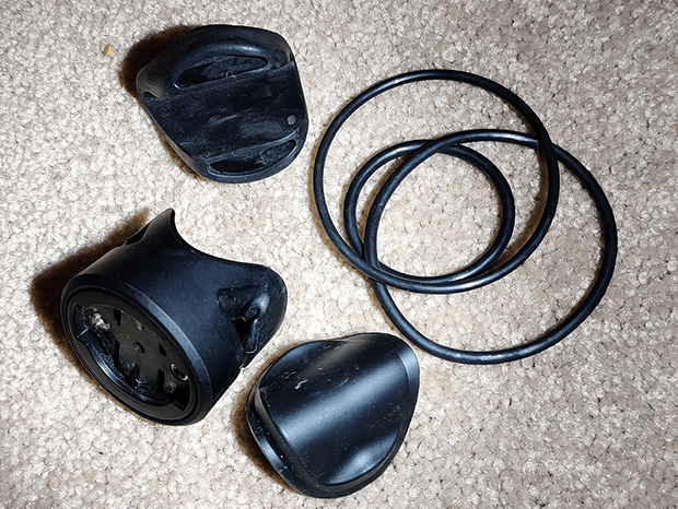 The unit has a ¼ turn mount interface on the back, identical to the ones that you’re probably accustomed to seeing on Garmin head units. Just like those head units, the Varia comes with a plastic mount that attaches to the light/radar via the ¼ turn interface and to your bike via an assortment of shims and rubber bands.