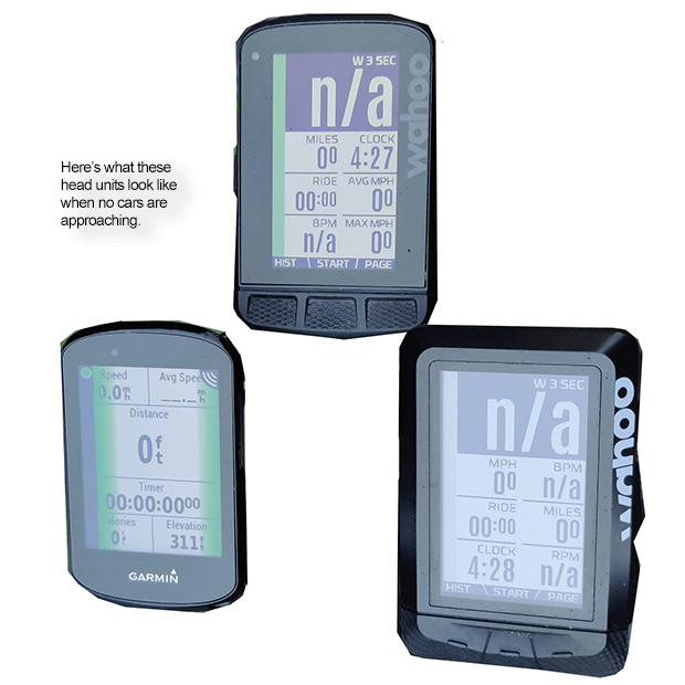 (On all the images below, these head units were all on my bike, all synced to a Varia, all picking up the same signal. You can see what these head units did with that signal.)