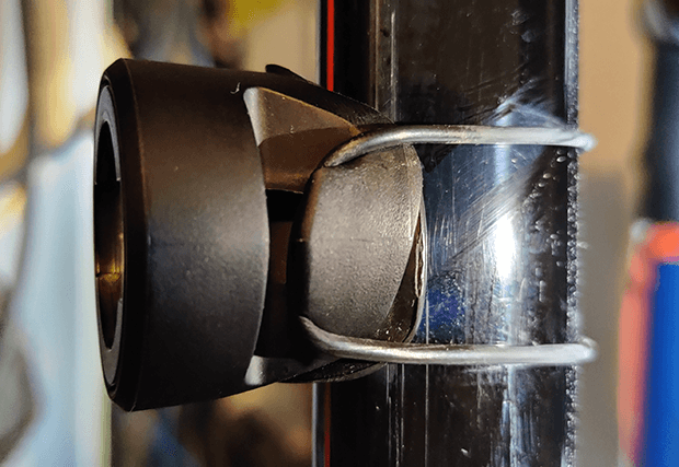 …and so far so good. The system has held fast on all manner of terrain and on a variety of shapes/sizes of seat posts, but I’d still much prefer a better solution, even if it’s just a more secure (looking?) rubber band mount. Our publisher (Dan Empfield) remarked on this as well, but added, “Danged if it doesn’t always stay on the bike.”