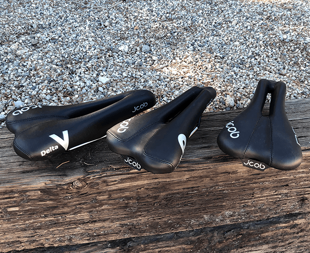 Then there are the JCOB saddles you sit atop, not in front of. I would have called this the V Flow family a year ago, but I'll soon need to change that because the V Flow model names appear to be going away. These are often saddles used in no-draft tri, but they’re not limited to this use case, because you can place most of your weight on them. Hence the "Delta" nomenclature attached to them. This is, according to my own way of categorizing JCOB's saddles, the second "family" of saddles in the JCOB line.