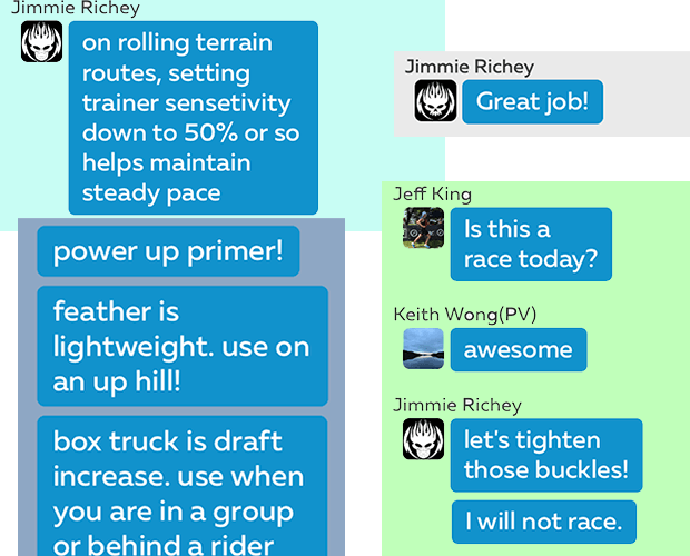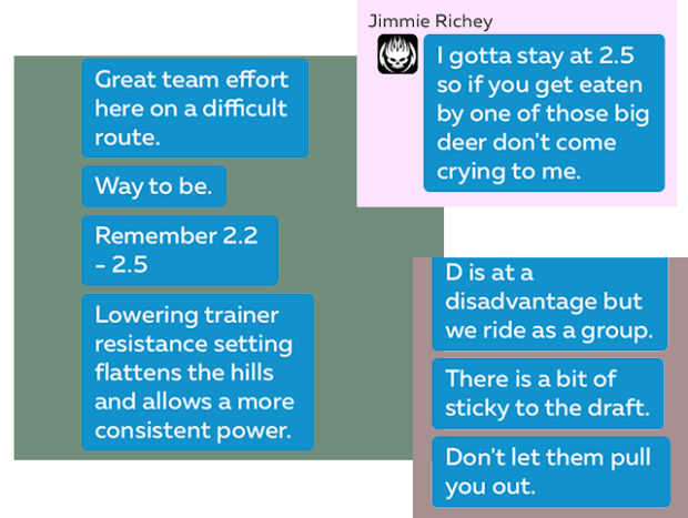 What you see here are screenshots from my iPhone of Zwift’s Companion App. It’s the only way to get a transcript of the in-game messages during a ride. It is hard to message in-game when everyone is near his or her limit trying to keep up. The easiest way to illustrate the effect of Jimmie’s leadership was to just snap some screenshots of his messaging. The volume of Jimmie's in-game message help is remarkable.
