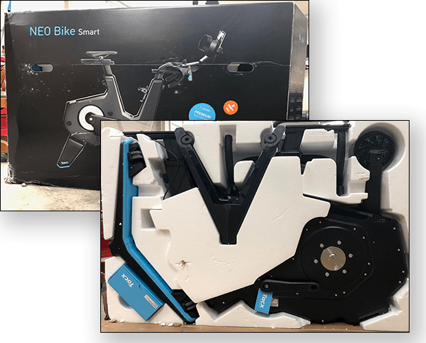 As for how you get this bike, do not worry about getting it mail order. Tacx packages this as if it was shipping 120 pounds of nitro glycerin. They could drop this from a plane onto your front yard, with no parachute, and the box would protect the cargo. It’s easy to put together, and quick. And intuitive. It’ll take you about an hour to get up and running. Above is what the box looks like, and inset into that image is what the box looks like with one side of the box peeled away. That is a massive stryrofoam block, silhoutettes of the bike’s assemblies carved into it.