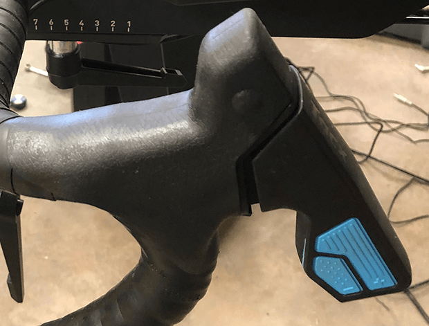 The shifting buttons are here, in blue. Big and little. That's upshift and downshift. Cassette shifting on the right lever, front derailleur shifting on the left lever. On one lever, the larger button is upshift and on the other paddle the larger paddle is downshift. I can almost promise you – I don't know this for a fact but I'm almost-promising you anyway, by intuition – these shift paddles will become programmable at some time in the future. As of now, I can certainly live with how they currently shift.