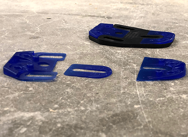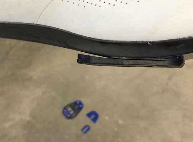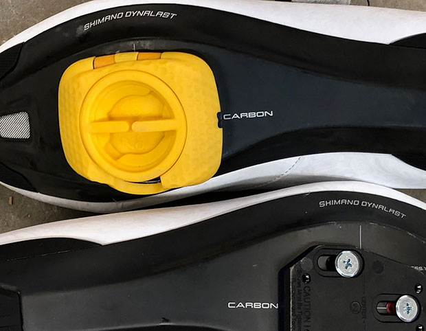 Not to worry. Speedplay’s cleat kit includes a second set of (purple) plug-ins that replace a set factory installed plug-ins, giving the adapter plate a more concave aspect. It takes just seconds to pop out the pre-installed purple inserts and pop in the more concave inserts. This swap-out makes the cleat fit the bottom of my Shimano shoe perfectly as you can see.