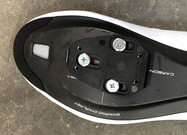 As you see just below, I push the plate all the way back on its adjustment slots, because this is my default starting place. I’d rather have the cleats too far back than too far forward when I'm riding. If I find I need to repent, and move them a little forward of this spot, okay. But I rarely find the need to do that.