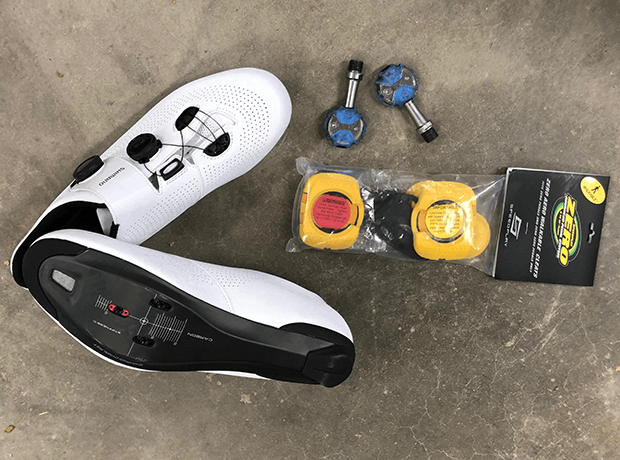 Because I am currently rotating between Speedplay Zeros and Garmin Vector 3s, I really needed now 2 pairs of shoes. And because I never screwed up the courage to plunk down for a pair of RC9s, I kept writing about them but without the firsthand experience of owning them. I thought it might be interesting to test this shoe against Shimano’s RC7, to see if there was a meaningful difference, to know if you need to spend the extra money for the top model. The RC9 retails for $425, and the RC7 for $225. (If you see these at lesser prices it’s likely they’re not the 2020 shoe.) I mounted the Garmin cleats on the RC9, and the Speedplay cleats on the RC7.