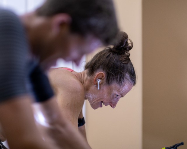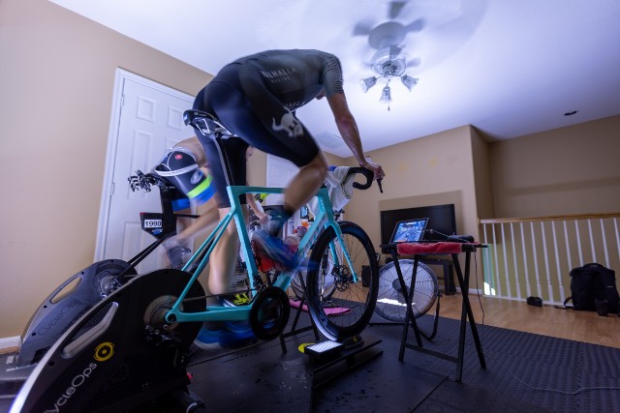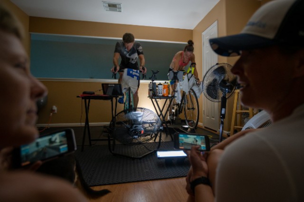 Jana and Jorge Martinez hosted the showdown at their E3 Training Solution's pain cave, complete with Saris H1 and H2 trainers, each fixed atop a homemade rocker board, enough fans to keep the room cool, a shared table to stay on top of hydration and a stable internet connection to run Zwift.