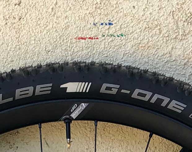 You’ll see 3 marks on the wall in that image above, and a closeup of that image is below. This is the measured height of the inflated tire/wheel. The smallest wheel radius of the 3 is the 700c Zipp 303 S with the Schwalbe Pro One 30mm, and it’s got a wheel/tire radius of 345mm (it's the red line). Next larger is the HED Emporia with Schwalbe G-One Bites in 53mm (green line). Even though the wheel is smaller (the bead diameter of 700c is 622mm, the bead diameter of 650b is 584mm), the distance from the wheel axle to the ground is actually 2mm taller.