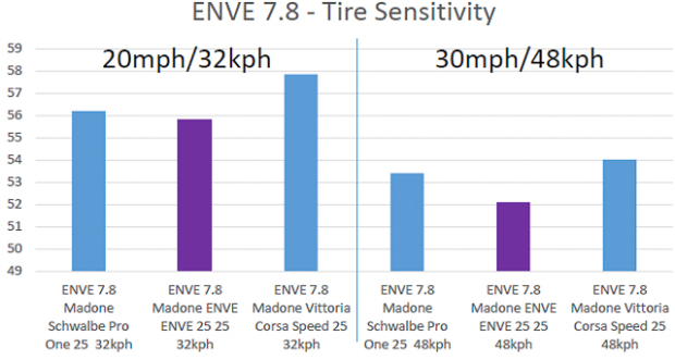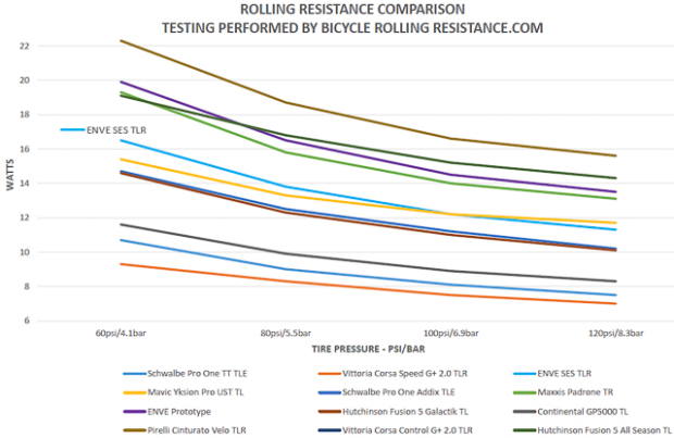 This chart shows the performance of the SES tire compared to the Schwalbe Pro One and the Vittoria Corsa Speed. The Y axis represents watts-to-spin two wheels, without a rider. ENVE claims best-in-class aero performance, and that adding their tires to non-ENVE wheels will reduce aerodynamic drag.