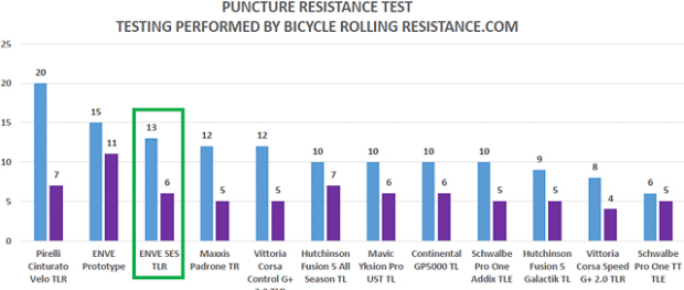 Bicycle Rolling Resistance performed an independent puncture test for the SES tire, seen above (the light blue lines represent tread performance, while the purple lines represent sidewall performance). This brings good news, putting the SES above known performers such as the Continental GP5000 TL. While not seen on this chart, weight is also competitive, at 256 grams in 25mm size – compared to 295 grams for the Conti.