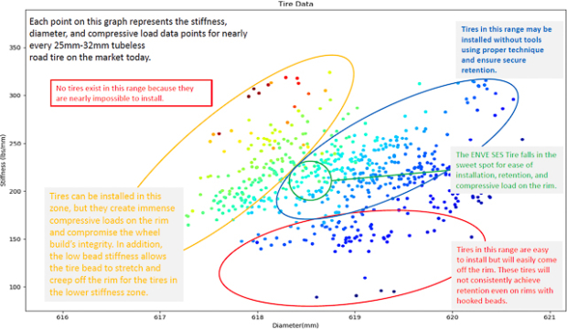The chart above shows data points from ENVE’s own test rig, which we saw in the flesh. The Y axis represents bead stiffness, while the X axis represents bead diameter. The goal is to have a narrow clump of data points towards the center of the graph. ENVE has a list of approved (and unapproved) tires for their wheels. They generated this list by testing all of these tires – and those that are too far out of the desired range of bead stiffness and diameter don’t make the cut (or if the bead diameter between samples of the same tire model are wildly inconsistent).
