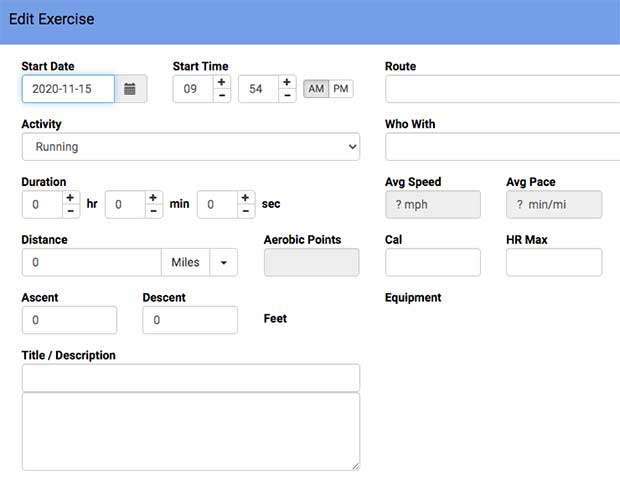 You'll note two ways you can make an entry. One is, you just log the workout, by hand. In this case you click Log a Workout and the screen below appears. It's pretty intuitive.