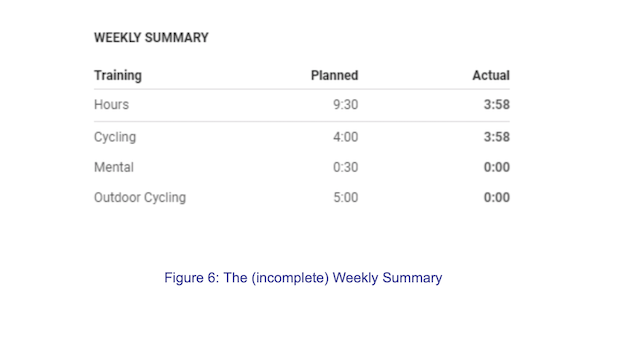 It shows that I had 9:30 planned – the sum of my indoor, outdoor, and mental training. But it shows 3:58 for actual even though I completed everything but the 30 minutes of mental training. I rode for about 8 hours on the weekend. What gives!?