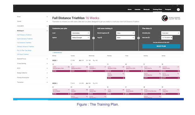 Now, finally, on to training plan generation. You start by selecting amongst a broad spectrum of basic plan profiles for roadies, triathletes, off-season, gravel, MTB, etc. Each with its own sub-categories. There are over 40 options covering just about everyone who might throw a leg over a bike, indoors or outdoors. The below figure shows an example of a 16-week “full distance” triathlon plan. And within a plan, there are a lot more options, like level (e.g. intermediate, advanced), inclusion of outdoors workouts, whether to schedule strength, yoga, or mental toughness training (covered in the 2nd article in this series), and a start and finish date.