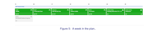 Green represents completed workouts. I skipped the still-gray mental training workout – though I highly recommend them – because I have no races anywhere on my horizon, and it’s hard for me to focus well on those sessions without a concrete goal. Though after my last few performances on the Slowtwitch Zwift team, maybe I should reconsider that.