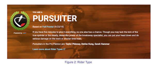 SUF also assigns you a “Rider Type,” and has designated me a “Pursuiter.” Which is nice because I was training for pursuit when I last took the Full Frontal test. The Rider Type designation isn’t just for fun, but also helps identify workouts and plans going forward. If you’re not the type you thought you were – or want to be – it’s a useful signal that you might need a change in your training plan, and focus more on workouts directed at improving the power durations indicated by the type you’re aiming for. This identification of type isn’t unique to SUF,and is prevalent in other indoor training apps and analysis tools – though methods vary.